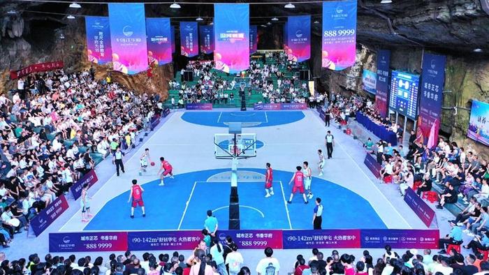 随着比赛的推进,场上球员每一个精彩动作都引发了雷鸣般的掌声。篮球击地的声音、球鞋摩擦地面的声音及观众的欢呼声在洞壁间来回反射,形成天然立体环绕声,交织成独特的交响乐。